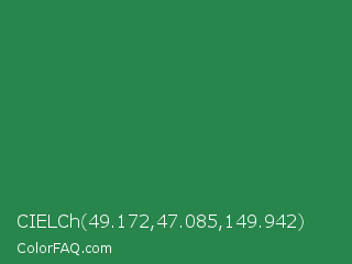 CIELCh 49.172,47.085,149.942 Color is a normal green color and the nearest color is Sea Green #2e8b57. Hex code #28854b and RGB value is rgb(40,133,75). In RGB color space, this color is composed of 16% red, 52% green, 29% blue, In CMYK color space, this color is composed of 70% cyan, 0% magenta, 44% yellow , 48% black , In HSL color space, this color has a hue angle of 143° , 54% saturation and 34% lightness.