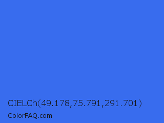 CIELCh 49.178,75.791,291.701 Color is a normal blue color and the nearest color is Ultramarine Blue #4166f5. Hex code #386cee and RGB value is rgb(56,108,238). In RGB color space, this color is composed of 22% red, 42% green, 93% blue, In CMYK color space, this color is composed of 76% cyan, 55% magenta, 0% yellow , 7% black , In HSL color space, this color has a hue angle of 223° , 84% saturation and 58% lightness.