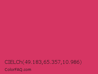 CIELCh 49.183,65.357,10.986 Color is a normal rose color and the nearest color is Cerise Red #de3163. Hex code #d63563 and RGB value is rgb(214,53,99). In RGB color space, this color is composed of 84% red, 21% green, 39% blue, In CMYK color space, this color is composed of 0% cyan, 75% magenta, 54% yellow , 16% black , In HSL color space, this color has a hue angle of 343° , 66% saturation and 52% lightness.