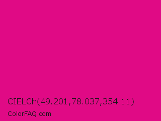 CIELCh 49.201,78.037,354.11 Color is a normal magenta color and the nearest color is Mexican Pink #e4007c. Hex code #e00a85 and RGB value is rgb(224,10,133). In RGB color space, this color is composed of 88% red, 4% green, 52% blue, In CMYK color space, this color is composed of 0% cyan, 96% magenta, 41% yellow , 12% black , In HSL color space, this color has a hue angle of 326° , 91% saturation and 46% lightness.
