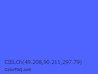 CIELCh 49.208,90.211,297.79 Color is a light blue color and the nearest color is Ultramarine Blue #4166f5. Hex code #4e63ff and RGB value is rgb(78,99,255). In RGB color space, this color is composed of 31% red, 39% green, 100% blue, In CMYK color space, this color is composed of 69% cyan, 61% magenta, 0% yellow , 0% black , In HSL color space, this color has a hue angle of 233° , 100% saturation and 65% lightness.