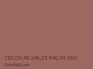 CIELCh 49.246,23.946,34.569 Color is a normal red color and the nearest color is Dark Chestnut #986960. Hex code #9c685f and RGB value is rgb(156,104,95). In RGB color space, this color is composed of 61% red, 41% green, 37% blue, In CMYK color space, this color is composed of 0% cyan, 33% magenta, 39% yellow , 39% black , In HSL color space, this color has a hue angle of 9° , 24% saturation and 49% lightness.