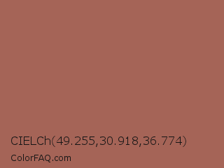 CIELCh 49.255,30.918,36.774 Color is a normal red color and the nearest color is Redwood #a45a52. Hex code #a56457 and RGB value is rgb(165,100,87). In RGB color space, this color is composed of 65% red, 39% green, 34% blue, In CMYK color space, this color is composed of 0% cyan, 39% magenta, 47% yellow , 35% black , In HSL color space, this color has a hue angle of 10° , 31% saturation and 49% lightness.