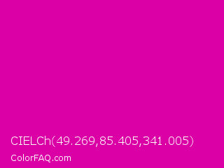 CIELCh 49.269,85.405,341.005 Color is a normal magenta color and the nearest color is Hollywood Cerise #f400a1. Hex code #db00a6 and RGB value is rgb(219,0,166). In RGB color space, this color is composed of 86% red, 0% green, 65% blue, In CMYK color space, this color is composed of 0% cyan, 100% magenta, 24% yellow , 14% black , In HSL color space, this color has a hue angle of 315° , 100% saturation and 43% lightness.