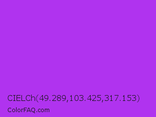 CIELCh 49.289,103.425,317.153 Color is a normal purple color and the nearest color is Veronica #a020f0. Hex code #b033ef and RGB value is rgb(176,51,239). In RGB color space, this color is composed of 69% red, 20% green, 94% blue, In CMYK color space, this color is composed of 26% cyan, 79% magenta, 0% yellow , 6% black , In HSL color space, this color has a hue angle of 280° , 85% saturation and 57% lightness.