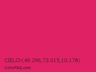 CIELCh 49.296,73.015,10.178 Color is a normal rose color and the nearest color is Razzmatazz #e3256b. Hex code #e02163 and RGB value is rgb(224,33,99). In RGB color space, this color is composed of 88% red, 13% green, 39% blue, In CMYK color space, this color is composed of 0% cyan, 85% magenta, 56% yellow , 12% black , In HSL color space, this color has a hue angle of 339° , 75% saturation and 50% lightness.