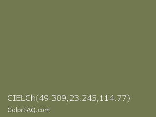CIELCh 49.309,23.245,114.77 Color is a normal lime color and the nearest color is Go Ben #726d4e. Hex code #727951 and RGB value is rgb(114,121,81). In RGB color space, this color is composed of 45% red, 47% green, 32% blue, In CMYK color space, this color is composed of 6% cyan, 0% magenta, 33% yellow , 53% black , In HSL color space, this color has a hue angle of 71° , 20% saturation and 40% lightness.