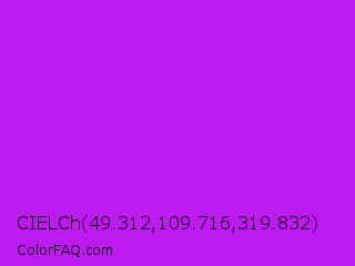 CIELCh 49.312,109.716,319.832 Color is a normal purple color and the nearest color is Vivid Mulberry #b80ce3. Hex code #bd1af0 and RGB value is rgb(189,26,240). In RGB color space, this color is composed of 74% red, 10% green, 94% blue, In CMYK color space, this color is composed of 21% cyan, 89% magenta, 0% yellow , 6% black , In HSL color space, this color has a hue angle of 286° , 88% saturation and 52% lightness.