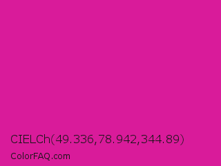 CIELCh 49.336,78.942,344.89 Color is a normal magenta color and the nearest color is Barbie Pink #e0218a. Hex code #d91b9a and RGB value is rgb(217,27,154). In RGB color space, this color is composed of 85% red, 11% green, 60% blue, In CMYK color space, this color is composed of 0% cyan, 88% magenta, 29% yellow , 15% black , In HSL color space, this color has a hue angle of 320° , 78% saturation and 48% lightness.