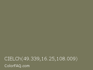 CIELCh 49.339,16.25,108.009 Color is a normal yellow color and the nearest color is Pablo #776f61. Hex code #77775b and RGB value is rgb(119,119,91). In RGB color space, this color is composed of 47% red, 47% green, 36% blue, In CMYK color space, this color is composed of 0% cyan, 0% magenta, 24% yellow , 53% black , In HSL color space, this color has a hue angle of 60° , 13% saturation and 41% lightness.