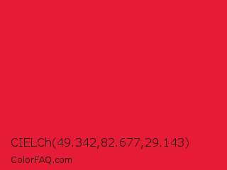 CIELCh 49.342,82.677,29.143 Color is a normal red color and the nearest color is Alizarin Crimson #e32636. Hex code #e61b36 and RGB value is rgb(230,27,54). In RGB color space, this color is composed of 90% red, 11% green, 21% blue, In CMYK color space, this color is composed of 0% cyan, 88% magenta, 77% yellow , 10% black , In HSL color space, this color has a hue angle of 352° , 80% saturation and 50% lightness.