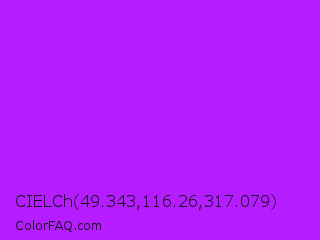 CIELCh 49.343,116.26,317.079 Color is a normal purple color and the nearest color is Veronica #a020f0. Hex code #b51cff and RGB value is rgb(181,28,255). In RGB color space, this color is composed of 71% red, 11% green, 100% blue, In CMYK color space, this color is composed of 29% cyan, 89% magenta, 0% yellow , 0% black , In HSL color space, this color has a hue angle of 280° , 100% saturation and 55% lightness.