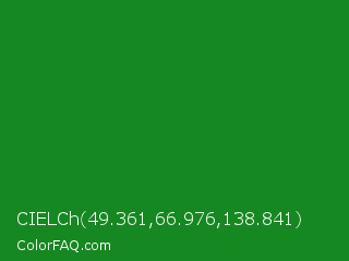 CIELCh 49.361,66.976,138.841 Color is a normal green color and the nearest color is Forest Green #228b22. Hex code #168821 and RGB value is rgb(22,136,33). In RGB color space, this color is composed of 9% red, 53% green, 13% blue, In CMYK color space, this color is composed of 84% cyan, 0% magenta, 76% yellow , 47% black , In HSL color space, this color has a hue angle of 126° , 72% saturation and 31% lightness.