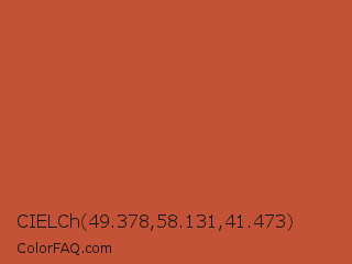 CIELCh 49.378,58.131,41.473 Color is a normal red color and the nearest color is Mojo #c04737. Hex code #c35236 and RGB value is rgb(195,82,54). In RGB color space, this color is composed of 76% red, 32% green, 21% blue, In CMYK color space, this color is composed of 0% cyan, 58% magenta, 72% yellow , 24% black , In HSL color space, this color has a hue angle of 12° , 57% saturation and 49% lightness.
