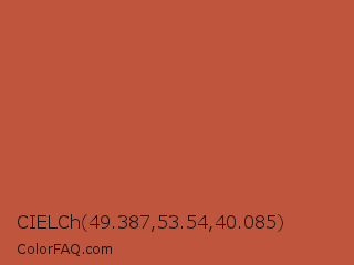 CIELCh 49.387,53.54,40.085 Color is a normal red color and the nearest color is Crail #b95140. Hex code #bf553d and RGB value is rgb(191,85,61). In RGB color space, this color is composed of 75% red, 33% green, 24% blue, In CMYK color space, this color is composed of 0% cyan, 55% magenta, 68% yellow , 25% black , In HSL color space, this color has a hue angle of 11° , 52% saturation and 49% lightness.