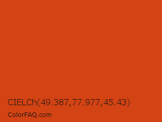 CIELCh 49.387,77.977,45.43 Color is a normal color and the nearest color is Sinopia #cb410b. Hex code #d34313 and RGB value is rgb(211,67,19). In RGB color space, this color is composed of 83% red, 26% green, 7% blue, In CMYK color space, this color is composed of 0% cyan, 68% magenta, 91% yellow , 17% black , In HSL color space, this color has a hue angle of 15° , 83% saturation and 45% lightness.