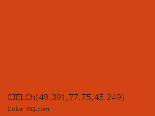 CIELCh 49.391,77.75,45.249 Color is a normal color and the nearest color is Sinopia #cb410b. Hex code #d34314 and RGB value is rgb(211,67,20). In RGB color space, this color is composed of 83% red, 26% green, 8% blue, In CMYK color space, this color is composed of 0% cyan, 68% magenta, 91% yellow , 17% black , In HSL color space, this color has a hue angle of 15° , 83% saturation and 45% lightness.