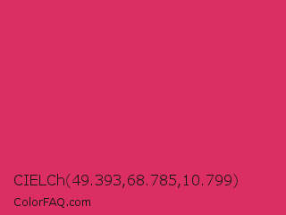 CIELCh 49.393,68.785,10.799 Color is a normal rose color and the nearest color is Cerise Red #de3163. Hex code #db2e63 and RGB value is rgb(219,46,99). In RGB color space, this color is composed of 86% red, 18% green, 39% blue, In CMYK color space, this color is composed of 0% cyan, 79% magenta, 55% yellow , 14% black , In HSL color space, this color has a hue angle of 342° , 71% saturation and 52% lightness.