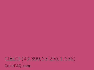 CIELCh 49.399,53.256,1.536 Color is a normal rose color and the nearest color is Fuchsia Rose #c74375. Hex code #c54975 and RGB value is rgb(197,73,117). In RGB color space, this color is composed of 77% red, 29% green, 46% blue, In CMYK color space, this color is composed of 0% cyan, 63% magenta, 41% yellow , 23% black , In HSL color space, this color has a hue angle of 339° , 52% saturation and 53% lightness.