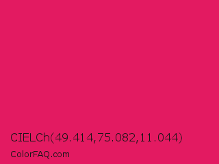 CIELCh 49.414,75.082,11.044 Color is a normal rose color and the nearest color is Ruby #e0115f. Hex code #e31a61 and RGB value is rgb(227,26,97). In RGB color space, this color is composed of 89% red, 10% green, 38% blue, In CMYK color space, this color is composed of 0% cyan, 89% magenta, 57% yellow , 11% black , In HSL color space, this color has a hue angle of 339° , 79% saturation and 50% lightness.
