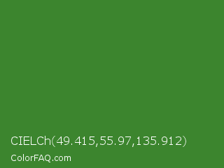 CIELCh 49.415,55.97,135.912 Color is a normal green color and the nearest color is Sap Green #507d2a. Hex code #3c852e and RGB value is rgb(60,133,46). In RGB color space, this color is composed of 24% red, 52% green, 18% blue, In CMYK color space, this color is composed of 55% cyan, 0% magenta, 65% yellow , 48% black , In HSL color space, this color has a hue angle of 110° , 49% saturation and 35% lightness.