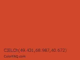 CIELCh 49.431,68.987,40.672 Color is a normal red color and the nearest color is Valencia #d84437. Hex code #cf472b and RGB value is rgb(207,71,43). In RGB color space, this color is composed of 81% red, 28% green, 17% blue, In CMYK color space, this color is composed of 0% cyan, 66% magenta, 79% yellow , 19% black , In HSL color space, this color has a hue angle of 10° , 66% saturation and 49% lightness.