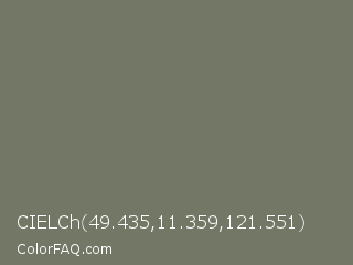 CIELCh 49.435,11.359,121.551 Color is a normal lime color and the nearest color is Limed Ash #747d63. Hex code #727865 and RGB value is rgb(114,120,101). In RGB color space, this color is composed of 45% red, 47% green, 40% blue, In CMYK color space, this color is composed of 5% cyan, 0% magenta, 16% yellow , 53% black , In HSL color space, this color has a hue angle of 79° , 9% saturation and 43% lightness.