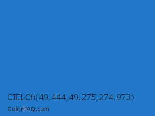 CIELCh 49.444,49.275,274.973 Color is a normal blue color and the nearest color is Bright Navy Blue #1974d2. Hex code #2078c9 and RGB value is rgb(32,120,201). In RGB color space, this color is composed of 13% red, 47% green, 79% blue, In CMYK color space, this color is composed of 84% cyan, 40% magenta, 0% yellow , 21% black , In HSL color space, this color has a hue angle of 209° , 73% saturation and 46% lightness.