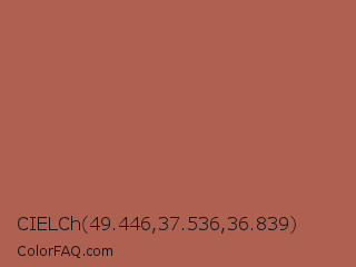 CIELCh 49.446,37.536,36.839 Color is a normal red color and the nearest color is Giants Club #b05c52. Hex code #ae6051 and RGB value is rgb(174,96,81). In RGB color space, this color is composed of 68% red, 38% green, 32% blue, In CMYK color space, this color is composed of 0% cyan, 45% magenta, 53% yellow , 32% black , In HSL color space, this color has a hue angle of 10° , 36% saturation and 50% lightness.