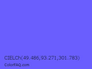 CIELCh 49.486,93.271,301.783 Color is a light indigo color and the nearest color is Very Light Blue #6666ff. Hex code #685dff and RGB value is rgb(104,93,255). In RGB color space, this color is composed of 41% red, 36% green, 100% blue, In CMYK color space, this color is composed of 59% cyan, 64% magenta, 0% yellow , 0% black , In HSL color space, this color has a hue angle of 244° , 100% saturation and 68% lightness.