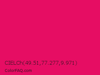 CIELCh 49.51,77.277,9.971 Color is a normal rose color and the nearest color is Raspberry #e30b5d. Hex code #e60d63 and RGB value is rgb(230,13,99). In RGB color space, this color is composed of 90% red, 5% green, 39% blue, In CMYK color space, this color is composed of 0% cyan, 94% magenta, 57% yellow , 10% black , In HSL color space, this color has a hue angle of 336° , 89% saturation and 48% lightness.