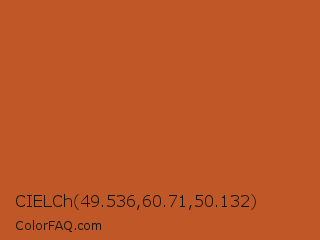 CIELCh 49.536,60.71,50.132 Color is a normal orange color and the nearest color is Tuscany #bd5e2e. Hex code #bf5726 and RGB value is rgb(191,87,38). In RGB color space, this color is composed of 75% red, 34% green, 15% blue, In CMYK color space, this color is composed of 0% cyan, 54% magenta, 80% yellow , 25% black , In HSL color space, this color has a hue angle of 19° , 67% saturation and 45% lightness.