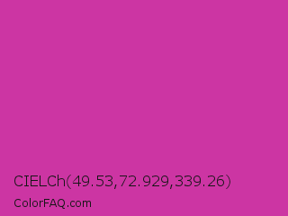 CIELCh 49.53,72.929,339.26 Color is a normal magenta color and the nearest color is Byzantine #bd33a4. Hex code #cc35a3 and RGB value is rgb(204,53,163). In RGB color space, this color is composed of 80% red, 21% green, 64% blue, In CMYK color space, this color is composed of 0% cyan, 74% magenta, 20% yellow , 20% black , In HSL color space, this color has a hue angle of 316° , 60% saturation and 50% lightness.