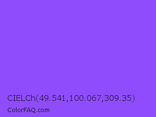 CIELCh 49.541,100.067,309.35 Color is a light violet color and the nearest color is Navy Purple #9457eb. Hex code #8f4cfc and RGB value is rgb(143,76,252). In RGB color space, this color is composed of 56% red, 30% green, 99% blue, In CMYK color space, this color is composed of 43% cyan, 70% magenta, 0% yellow , 1% black , In HSL color space, this color has a hue angle of 263° , 97% saturation and 64% lightness.