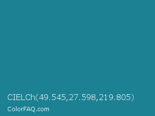 CIELCh 49.545,27.598,219.805 Color is a normal cyan color and the nearest color is Jelly Bean #297b9a. Hex code #1b8193 and RGB value is rgb(27,129,147). In RGB color space, this color is composed of 11% red, 51% green, 58% blue, In CMYK color space, this color is composed of 82% cyan, 12% magenta, 0% yellow , 42% black , In HSL color space, this color has a hue angle of 189° , 69% saturation and 34% lightness.