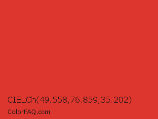 CIELCh 49.558,76.859,35.202 Color is a normal red color and the nearest color is CG Red #e03c31. Hex code #dc362e and RGB value is rgb(220,54,46). In RGB color space, this color is composed of 86% red, 21% green, 18% blue, In CMYK color space, this color is composed of 0% cyan, 75% magenta, 79% yellow , 14% black , In HSL color space, this color has a hue angle of 3° , 71% saturation and 52% lightness.
