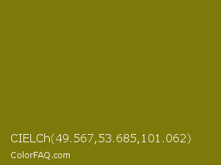 CIELCh 49.567,53.685,101.062 Color is a dark yellow color and the nearest color is Olive #808000. Hex code #7d790b and RGB value is rgb(125,121,11). In RGB color space, this color is composed of 49% red, 47% green, 4% blue, In CMYK color space, this color is composed of 0% cyan, 3% magenta, 91% yellow , 51% black , In HSL color space, this color has a hue angle of 58° , 84% saturation and 27% lightness.