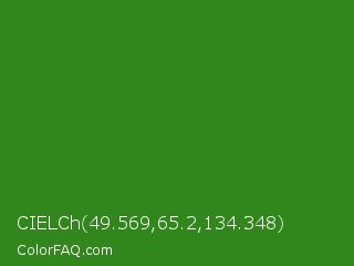 CIELCh 49.569,65.2,134.348 Color is a normal green color and the nearest color is La Palma #368716. Hex code #31871b and RGB value is rgb(49,135,27). In RGB color space, this color is composed of 19% red, 53% green, 11% blue, In CMYK color space, this color is composed of 64% cyan, 0% magenta, 80% yellow , 47% black , In HSL color space, this color has a hue angle of 108° , 67% saturation and 32% lightness.