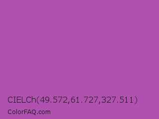 CIELCh 49.572,61.727,327.511 Color is a normal magenta color and the nearest color is Purple Plum #9c51b6. Hex code #b050af and RGB value is rgb(176,80,175). In RGB color space, this color is composed of 69% red, 31% green, 69% blue, In CMYK color space, this color is composed of 0% cyan, 55% magenta, 1% yellow , 31% black , In HSL color space, this color has a hue angle of 301° , 38% saturation and 50% lightness.