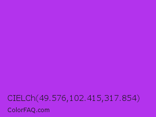 CIELCh 49.576,102.415,317.854 Color is a normal purple color and the nearest color is Veronica #a020f0. Hex code #b333ed and RGB value is rgb(179,51,237). In RGB color space, this color is composed of 70% red, 20% green, 93% blue, In CMYK color space, this color is composed of 24% cyan, 78% magenta, 0% yellow , 7% black , In HSL color space, this color has a hue angle of 281° , 84% saturation and 56% lightness.