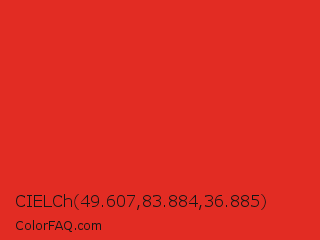 CIELCh 49.607,83.884,36.885 Color is a normal red color and the nearest color is Permanent Geranium Lake #e12c2c. Hex code #e22c23 and RGB value is rgb(226,44,35). In RGB color space, this color is composed of 89% red, 17% green, 14% blue, In CMYK color space, this color is composed of 0% cyan, 81% magenta, 85% yellow , 11% black , In HSL color space, this color has a hue angle of 3° , 77% saturation and 51% lightness.