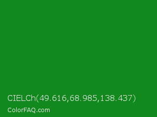 CIELCh 49.616,68.985,138.437 Color is a dark green color and the nearest color is Forest Green #228b22. Hex code #11891d and RGB value is rgb(17,137,29). In RGB color space, this color is composed of 7% red, 54% green, 11% blue, In CMYK color space, this color is composed of 88% cyan, 0% magenta, 79% yellow , 46% black , In HSL color space, this color has a hue angle of 126° , 78% saturation and 30% lightness.