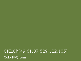 CIELCh 49.61,37.529,122.105 Color is a normal green color and the nearest color is Dingley #5d7747. Hex code #667e3e and RGB value is rgb(102,126,62). In RGB color space, this color is composed of 40% red, 49% green, 24% blue, In CMYK color space, this color is composed of 19% cyan, 0% magenta, 51% yellow , 51% black , In HSL color space, this color has a hue angle of 83° , 34% saturation and 37% lightness.