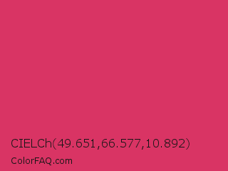 CIELCh 49.651,66.577,10.892 Color is a normal rose color and the nearest color is Cerise Red #de3163. Hex code #d93464 and RGB value is rgb(217,52,100). In RGB color space, this color is composed of 85% red, 20% green, 39% blue, In CMYK color space, this color is composed of 0% cyan, 76% magenta, 54% yellow , 15% black , In HSL color space, this color has a hue angle of 343° , 68% saturation and 53% lightness.