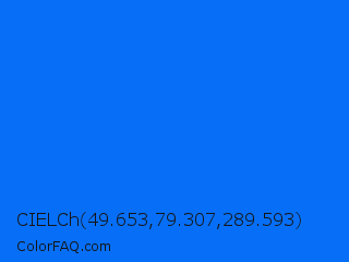 CIELCh 49.653,79.307,289.593 Color is a normal blue color and the nearest color is Brandeis Blue #0070ff. Hex code #076ff7 and RGB value is rgb(7,111,247). In RGB color space, this color is composed of 3% red, 44% green, 97% blue, In CMYK color space, this color is composed of 97% cyan, 55% magenta, 0% yellow , 3% black , In HSL color space, this color has a hue angle of 214° , 94% saturation and 50% lightness.