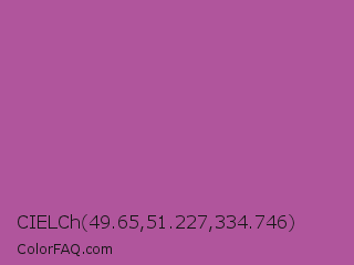 CIELCh 49.65,51.227,334.746 Color is a normal magenta color and the nearest color is Pearly Purple #b768a2. Hex code #b0559c and RGB value is rgb(176,85,156). In RGB color space, this color is composed of 69% red, 33% green, 61% blue, In CMYK color space, this color is composed of 0% cyan, 52% magenta, 11% yellow , 31% black , In HSL color space, this color has a hue angle of 313° , 37% saturation and 51% lightness.