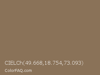 CIELCh 49.668,18.754,73.093 Color is a normal orange color and the nearest color is Shadow #8a795d. Hex code #8a7258 and RGB value is rgb(138,114,88). In RGB color space, this color is composed of 54% red, 45% green, 35% blue, In CMYK color space, this color is composed of 0% cyan, 17% magenta, 36% yellow , 46% black , In HSL color space, this color has a hue angle of 31° , 22% saturation and 44% lightness.