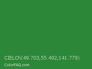 CIELCh 49.703,55.492,141.779 Color is a normal green color and the nearest color is Forest Green #228b22. Hex code #2d8738 and RGB value is rgb(45,135,56). In RGB color space, this color is composed of 18% red, 53% green, 22% blue, In CMYK color space, this color is composed of 67% cyan, 0% magenta, 59% yellow , 47% black , In HSL color space, this color has a hue angle of 127° , 50% saturation and 35% lightness.