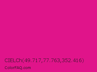 CIELCh 49.717,77.763,352.416 Color is a normal magenta color and the nearest color is Barbie Pink #e0218a. Hex code #e0148a and RGB value is rgb(224,20,138). In RGB color space, this color is composed of 88% red, 8% green, 54% blue, In CMYK color space, this color is composed of 0% cyan, 91% magenta, 38% yellow , 12% black , In HSL color space, this color has a hue angle of 325° , 84% saturation and 48% lightness.