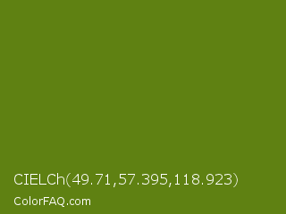 CIELCh 49.71,57.395,118.923 Color is a dark lime color and the nearest color is Avocado #568203. Hex code #5f8112 and RGB value is rgb(95,129,18). In RGB color space, this color is composed of 37% red, 51% green, 7% blue, In CMYK color space, this color is composed of 26% cyan, 0% magenta, 86% yellow , 49% black , In HSL color space, this color has a hue angle of 78° , 76% saturation and 29% lightness.